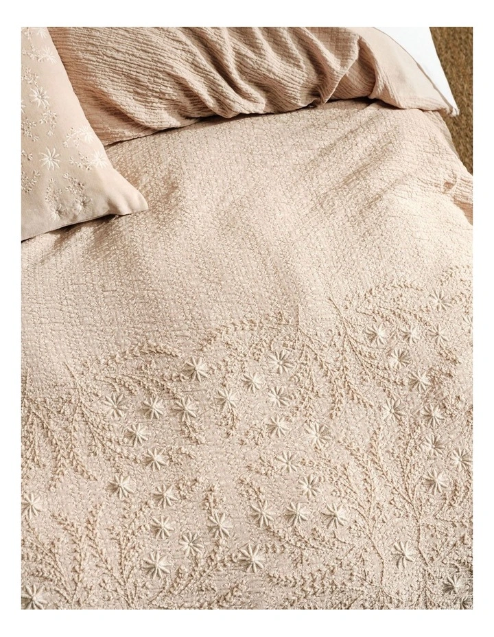 Every bit vintage with its textured cotton, Abigail in sand is a delicately embroidered and stone washed beauty that caters to every diehard romantic. Tie closures add to this alluring theme, which looks ravishing with its matching embroidered European pillowcases and cushion in cotton velvet.Â